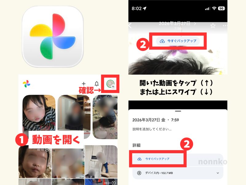 それだと一時的にアップロードされるだけで、スマホから動画を消すとリンク先も消えちゃうことがあるの。「今すぐバックアップ」で正式にクラウドへ保管してね。