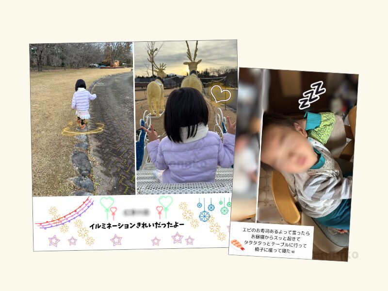 文字で説明しなくても、イラストをポンと置くだけで「楽しそう」「寝ている」といった雰囲気が伝わります。