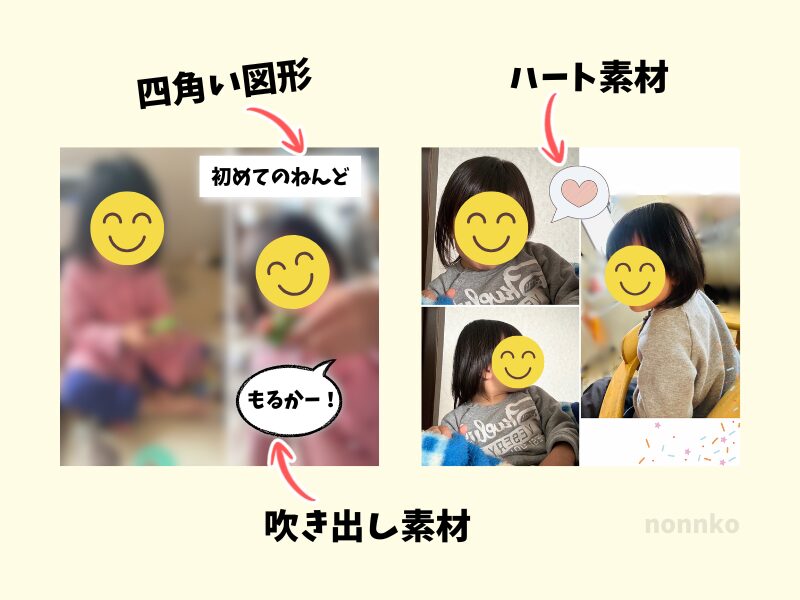 イラストも、「ハート」「音符」「にこにこ」など写真に合いそうなキーワードで検索して、挿絵感覚でちょこっと入れるだけ。