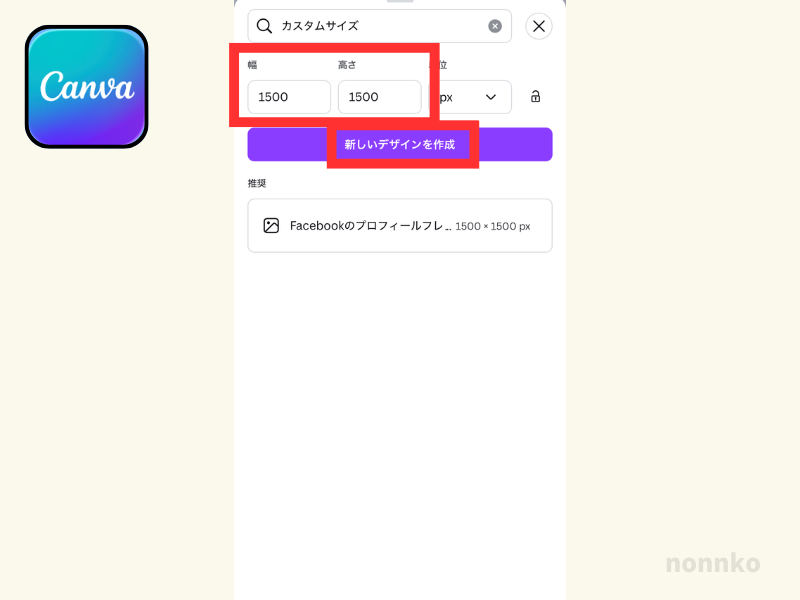 - Canvaでカスタムサイズ「1500×1500px」を作成
