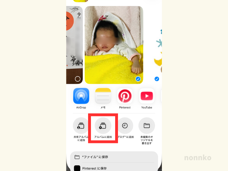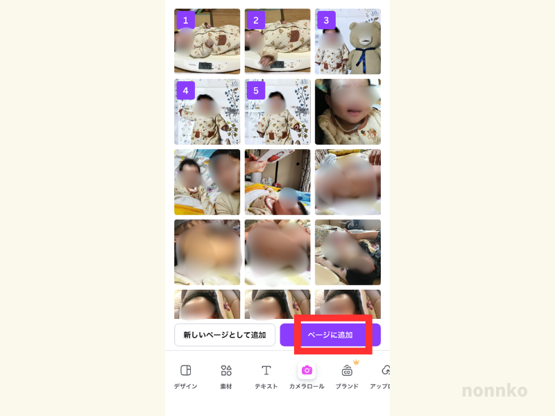 - 写真を2〜6枚くらい選択して「ページに追加」