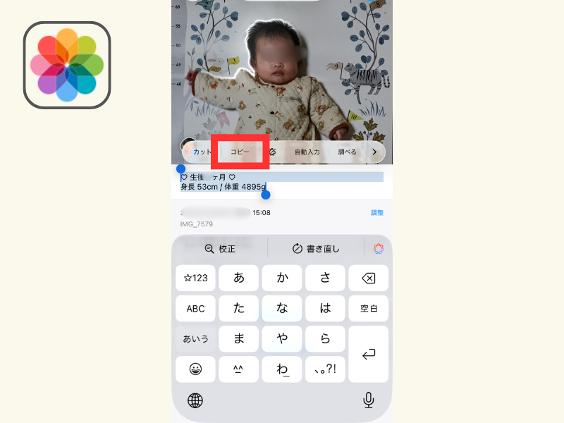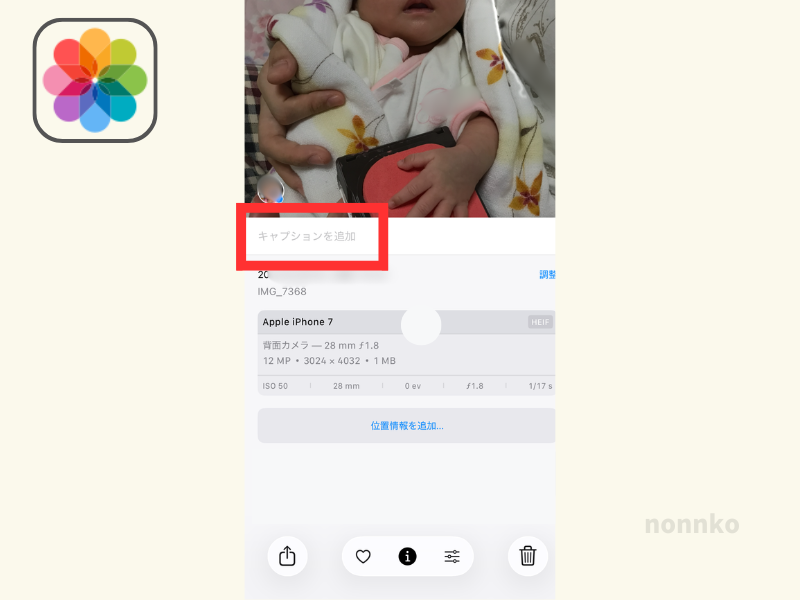 - 「テキスト」を追加し、写真アプリの「キャプション」をコピペして貼り付ける