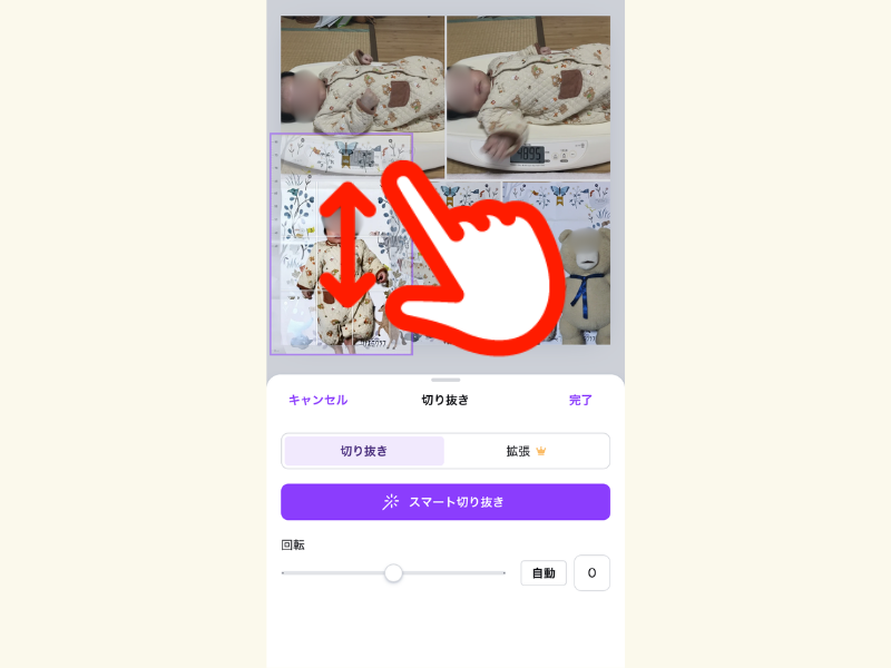 - 全てはまったら、写真の「切り抜き」や「自動調整」で写りを整える