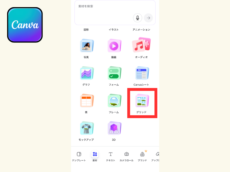 - 「素材」から、写真の枚数に合わせた「グリッド」を追加して、写真をはめる